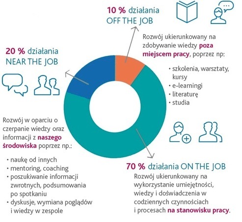 Ilustracja: Model 70-20-10 i propozycje działań rozwojowych, które można podejmować, ucząc się poprzez praktykę (warto, by stanowiła ona 70% czasu przeznaczonego na rozwój), uczenie się od innych (20% czasu przeznaczonego na rozwój) oraz formalne działania rozwojowe lub lekturę (10%).