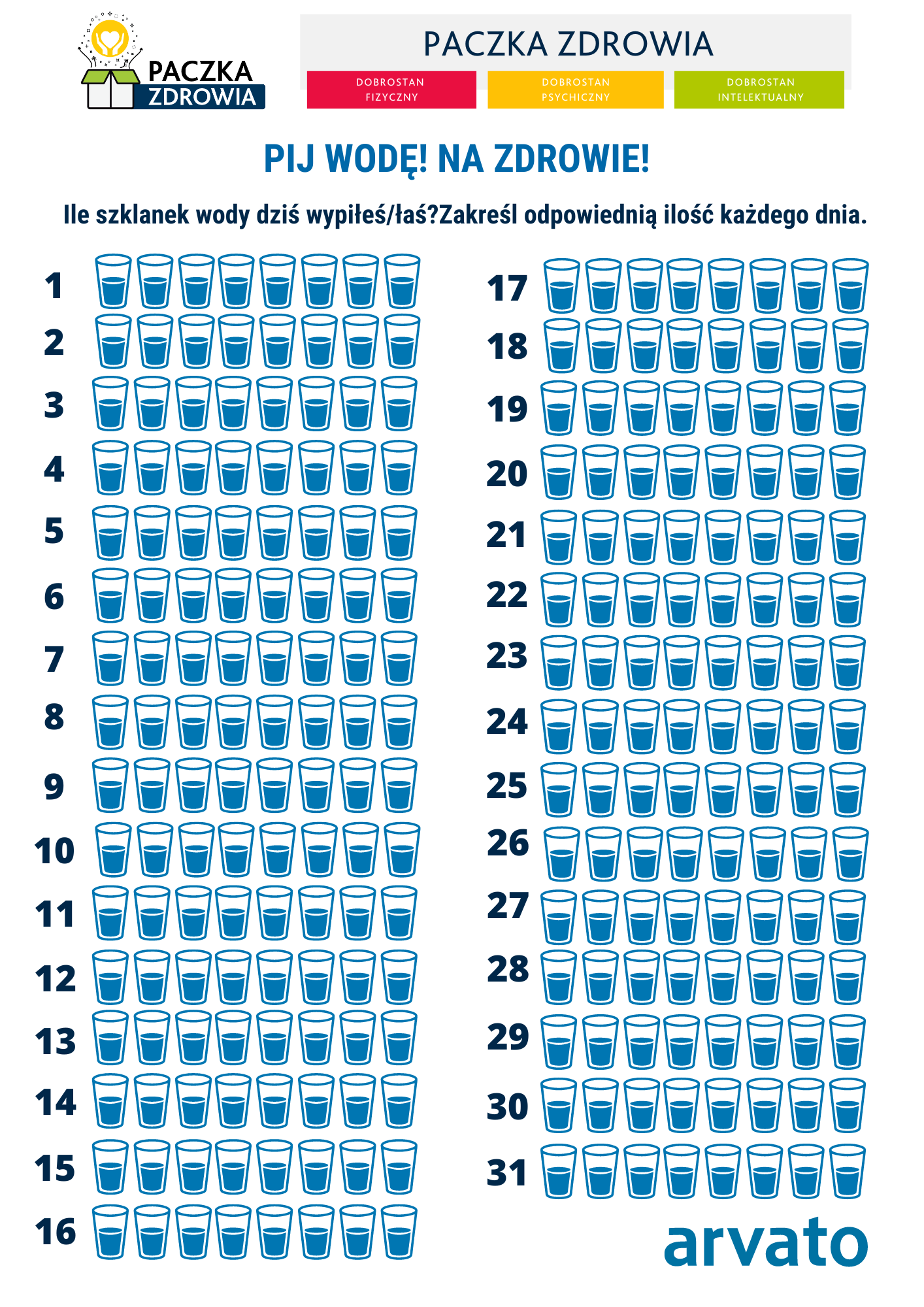 i codziennie zaznacz na nim liczbę szklanek wody, które udało Ci się wypić w ciągu dnia.