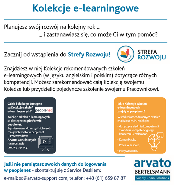 Nowością w Strefie Rozwoju są Kolekcje e-learningowe. Kolekcje e-learningowe to propozycje szkoleń dostępnych m.in. na platformie peoplenet, które mogą posłużyć jako pomoc przy rozwijaniu poszczególnych kompetencji ujętych w ramach modelu kompetencyjnego koncernu Bertelsmann oraz planowaniu rozwoju związanego z doskonaleniem m.in. kompetencji miękkich. Pełną listę Kolekcji e-learningowych oraz ich zawartość znajdziesz w kafelku Szkolenia e-learningowe.
